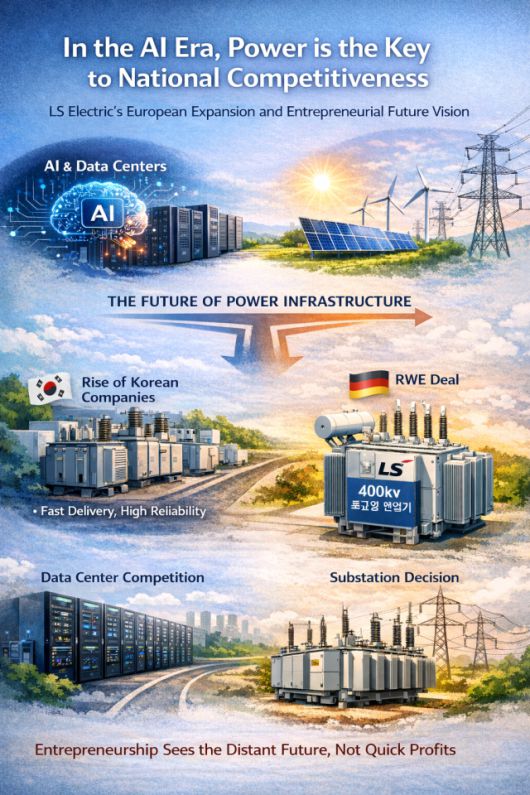 AI는 눈에 보이지 않지만, 전력은 물리적 현실이다. 그리고 이 현실을 누가 먼저 준비했느냐에 따라 국가의 산업 지형이 달라진다. LS일렉트릭의 유럽 진출은 한 기업의 수주 소식이 아니다. 미래를 먼저 믿고 투자한 기업가정신이 어디까지 갈 수 있는지를 보여주는 사례다. AI 시대의 패권은 서버실이 아니라 변전소에서, 그리고 그 변전소를 먼저 떠올린 기업가의 결단에서 갈린다.