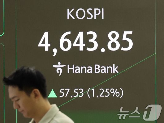 (서울=뉴스1) 황기선 기자 = 12일 오전 서울 중구 하나은행 딜링룸 전광판에 개장 시황이 나오고 있다. 이날 코스피 지수는 53.57포인트(1.17%) 오른 4639.89, 코스닥 지수는 0.56p(0.06%) 상승한 948.48, 원·달러환율은 3.7원 오른 1461.3원에 개장했다. 2026.1.12/뉴스1