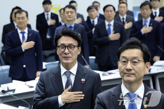 (서울=뉴스1) 박정호 기자 = 김민석 국무총리가 12일 오전 서울시 은평구 진흥로 한국행정연구원 대회의장에서 열린 5개처·원안위 업무보고에서 국민의례를 하고 있다. 2026.1.12/뉴스1