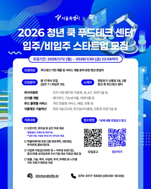 (서울=국제뉴스) 김서중 기자 = 서울시가 전 세계적인 K-푸드 열풍 속에서 미래 먹거리 산업의 핵심인 식품 제조와 푸드테크 분야를 선도할 창의적인 청년 창업가에 대한 지원을 2026년에도 이어간다.