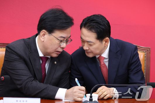 (서울=뉴스1) 신웅수 기자 = 장동혁 국민의힘 대표와 송언석 원내대표가 12일 서울 여의도 국회에서 열린 최고위원회의에서 대화하고 있다. 2026.1.12/뉴스1