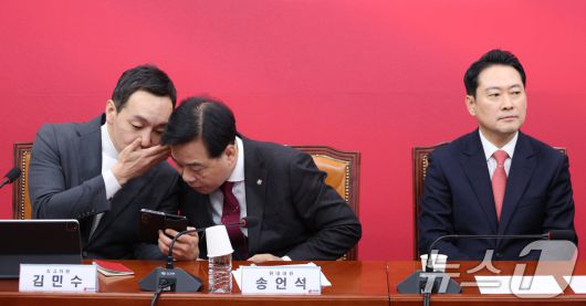 (서울=뉴스1) 신웅수 기자 = 송언석 국민의힘 원내대표와 김민수 최고위원이 12일 서울 여의도 국회에서 열린 최고위원회의에서 대화하고 있다. 2026.1.12/뉴스1