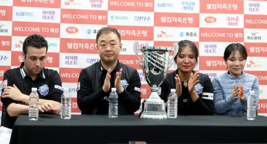 우리금융캐피탈 선수들이 우승 직후 기자회견을 하고 있다. 왼쪽부터 다비드 사파타, 엄상필, 스롱 피아비, 김민영. PBA 제공 |
