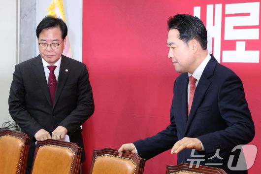 (서울=뉴스1) 신웅수 기자 = 장동혁 국민의힘 대표와 송언석 원내대표가 12일 서울 여의도 국회에서 열린 최고위원회의에 참석하고 있다. 2026.1.12/뉴스1phonalist@news1.krCopyright ⓒ 뉴스1. All rights reserved. 무단 전재 및 재배포, AI학습 이용 금지.