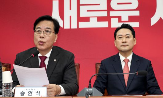 송 원내대표는 이날 국회에서 열린 당 최고위원회에서 한 신임 원내대표에게 △통일교 특검 △민주당 공천뇌물 의혹 특검 △대장동 항소포기 국정조사 등 이른바 ‘2특검 1국정조사’ 수용을 요구했다.