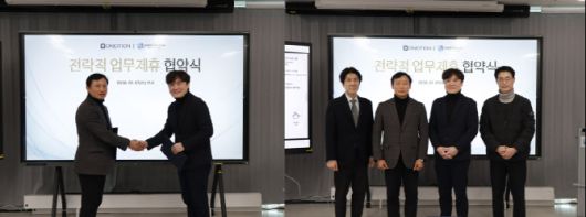 (좌) 업무제휴 협약식에서 문용만 가이드삼정 대표와 오문석 오모션 대표가 기념 촬영을 하고 있다. (우) 왼쪽부터 서영호 오모션 이사, 문용만 가이드삼정 대표, 오문석 오모션 대표, 박형 가이드삼정 이사. |