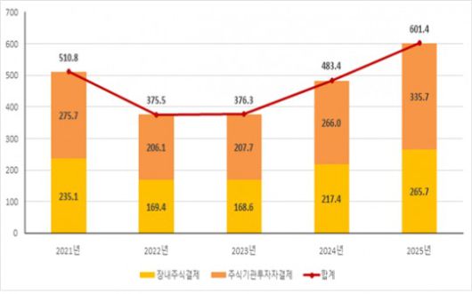 예탁원은 12일 2025년 주식결제대금 총액은 601조 4000억원 전년 483조 4000억원 대비 24.4% 증가했다고 12일 밝혔다. 일 평균 주식결제대금은 2조 5000억원이다.