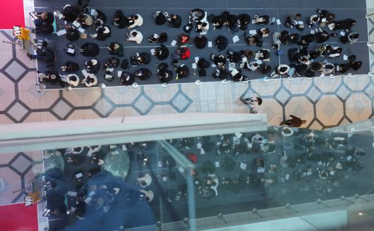 지난달 18일 서울 강남구 코엑스에서 열린 2026학년도 정시 대학입학정보박람회를 찾은 학부모와 입시생들이 입장하기 위해 앉아 기다리고 있다. 뉴시스 |