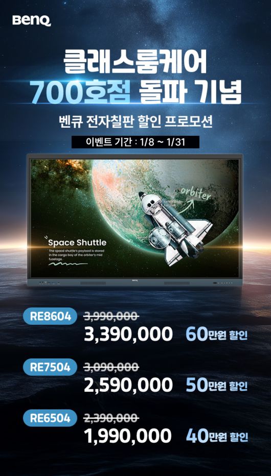 이를 기념해 2026년 1월 8일부터 1월 31일까지 전자칠판 RE 시리즈 주요 모델을 대상으로 최대 60만원 할인 혜택을 제공하는 프로모션을 진행한다.