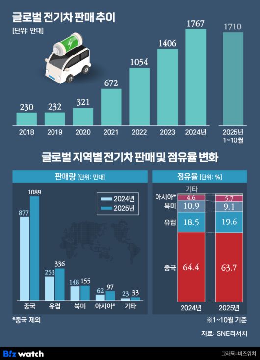 유럽연합(EU)이 2035년 내연기관차 판매 전면 금지 방침을 사실상 철회한 점도 전기차 확산 속도를 둔화시키고 있다. 여기에 CATL과 BYD 등 중국 업체들이 가격 경쟁력을 앞세워 시장 점유율을 빠르게 끌어올리면서 국내 업체들의 입지는 더욱 좁아지고 있다. 지난해 1~10월 기준 LG에너지솔루션·삼성SDI·SK온 등 국내 배터리 3사의 글로벌 전기차용 배터리 사용량 점유율 합계는 16.0%로, 전년 동기 대비 3.5%포인트 하락했다.