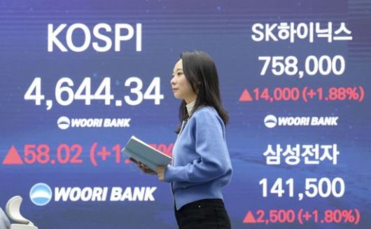 코스피 지수가 전 거래일 대비 53.57포인트 상승한 4639.89로 시작하며 사상 최고치를 재경신한 12일 서울 중구 우리은행 본점 딜링룸 전광판에 국내증시 현황이 표시돼 있다.