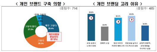 유튜브, 블로그, SNS 등 개인을 드러낼 수 있는 수단이 보편화되면서 교사로서의 전문성과 개인이 지닌 노하우를 기반으로 개인 브랜딩을 정립하는 사례가 늘고 있다. 이에 개인 브랜딩 계획이 있는지를 물어본 결과, 응답자의 67.9%는 본인의 교육 철학이나 전문성을 기반으로 도서 집필, 유튜브, 강연 등을 통해 개인 브랜드화에 대한 의향이 있는 것으로 나타났다.