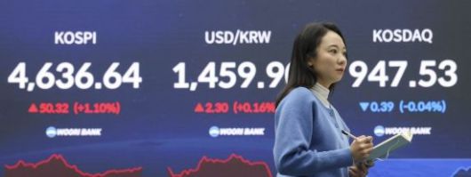 코스피 지수가 전 거래일 대비 53.57포인트 상승한 4639.89로 시작하며 사상 최고치를 재경신한 12일 서울 중구 우리은행 본점 딜링룸 전광판에 국내증시 현황이 표시돼 있다.