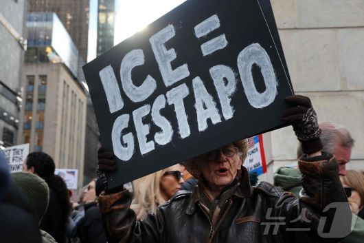 11일(현지시간) 미국 뉴욕시 맨해튼에서 도널드 트럼프 미국 행정부의 대내외 정책에 반대하는 '노 킹스'(No Kings) 시위가 열린 가운데, 한 시민이 이민세관단속국(ICE)을 규탄하는 손팻말을 들고 있다. 2025.01.11. ⓒ AFP=뉴스1 ⓒ News1 윤다정 기자 |