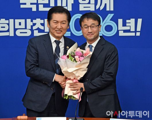 아시아투데이 송의주 기자 = 정청래 더불어민주당 대표(왼쪽)가 12일 국회에서 열린 최고위원회의에서 한병도 신임 원내대표에게 꽃다발을 전달하고 있다. ⓒ "젊은 파워, 모바일 넘버원 아시아투데이"