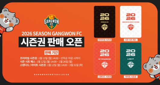 강원FC는 12일 오후 2시부터 2026시즌권을 판매한다. 2026시즌에는 프리미엄 시즌권을 비롯해 시즌 시트 패스, 스탠다드 시즌권, 라이트 시즌권, 기부 시즌권 등 다양한 권종을 운영한다.