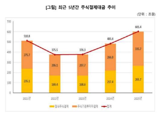 최근 5년간 추이를 보면 주식결제대금은 2022~2023년 정체 국면을 거친 뒤 2024년부터 다시 증가세로 전환됐다.