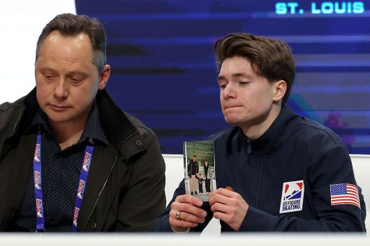 지난 8일(현지시간) 미 미조리주 세인트루이스 엔터프라이즈센터에서 열린 2026 전미피겨선수권대회에서 쇼트프로그램을 연기한 막심 나우모프가 부모와 찍은 옛 사진을 든 채 판정 결과를 기다리고 있다. [게티이미지] |