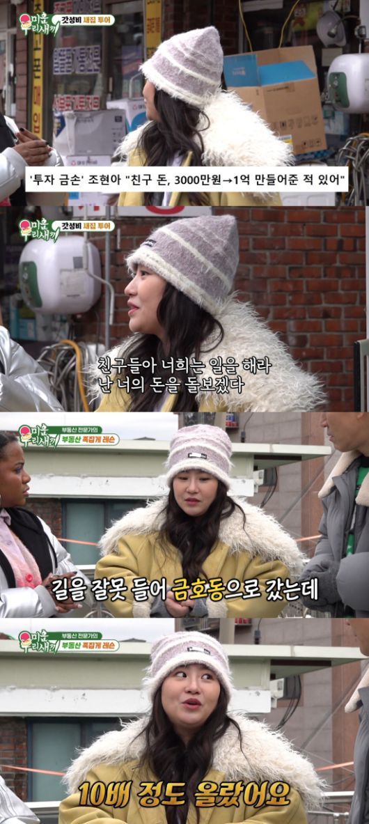무려 10배의 수익을 냈던 부동산 투자 일화도 고백했다. 조현아는 "제가 2016년에 길을 잘못들어서 금호동에 갔다. 택시가 잘못빠졌는데 위치가 너무 좋더라. 인프라만 보고 집을 구매했다. 초기 투자 비용 대비 현재 10배 정도가 올랐다"고 밝히며 '부동산계 여자 서장훈'이라는 칭호를 얻었다.