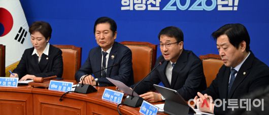 아시아투데이 송의주 기자 = 한병도 더불어민주당 신임 원내대표(오른쪽에서 두번째)가 12일 국회에서 열린 최고위원회의에서 발언을 하고 있다. ⓒ "젊은 파워, 모바일 넘버원 아시아투데이"