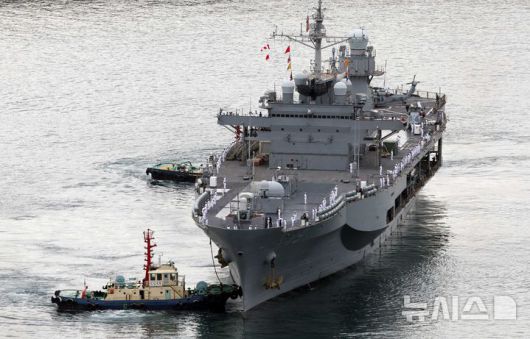 [부산=뉴시스] 하경민 기자 = 미국 해군 제7함대사령부 상륙지휘함인 '블루릿지'(LCC-19·1만9600t)가 25일 오전 부산 남구 해군작전사령부 부산작전기지에 입항하고 있다. 길이 194m, 폭 33m 규모에 승조원 1400여 명인 블루릿지함은 핵추진 항공모함인 로널드 레이건함(CVN-76)과 핵잠수함 10여척, 이지스 구축함 및 순양함 20여척, 항공기 300여 대를 지휘한다. 2025.09.25. yulnetphoto@newsis.com |