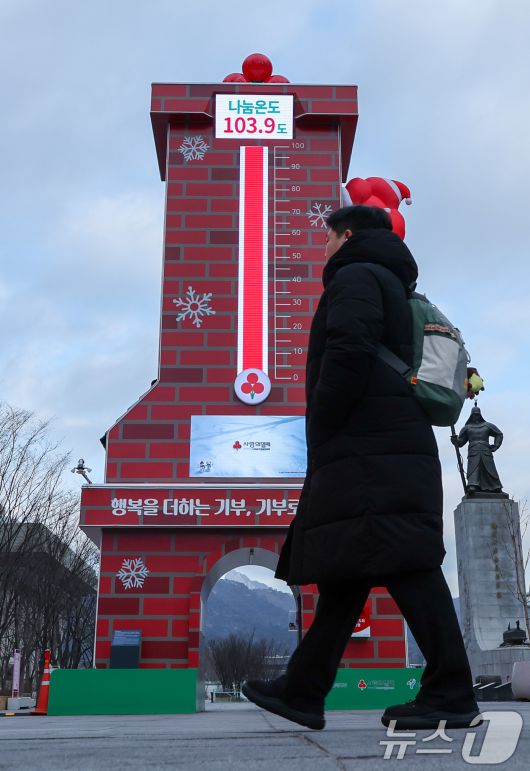 (서울=뉴스1) 안은나 기자 = 12일 서울 종로구 광화문 광장에 설치된 사랑의 온도탑 나눔온도가 103.9도를 나타내고 있다. 사랑의열매 사회복지공동모금회는 이날 희망2026나눔캠페인 사랑의 온도탑 나눔온도가 목표액 4500억 원을 넘긴 4676억 원을 달성해 100도를 돌파했다고 밝혔다. 2026.1.12/뉴스1