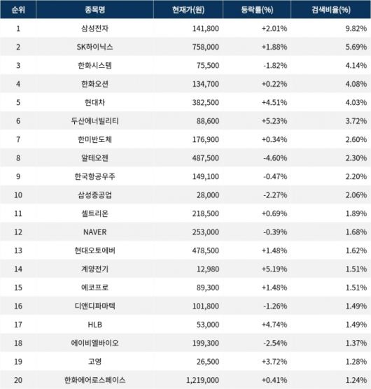 이어 SK하이닉스(000660)가 검색비율 2위를 기록하며 1.88%의 상승세를 보이고 있다. 검색비율 3위의 한화시스템(272210)은 1.82% 하락하며 약세를 보이고 있다. 검색비율 4위 한화오션(042660)은 개장 초반부터 0.22% 상승하며 큰 변동이 없는 모습이다. 검색비율 5위 현대차(005380)는 4.51% 상승하며 강세를 보이고 있다.