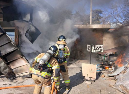 11일 오후 2시 27분쯤 의성군 비안면의 한 식당에서 화재가 발생해 출동한 소방당국이 불을 끄고 있다. /경북도 소방본부 |