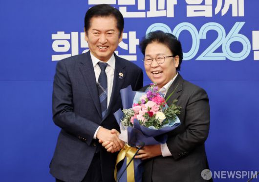 [서울=뉴스핌] 정일구 기자 = 정청래 더불어민주당 대표가 12일 오전 서울 여의도 국회에서 열린 최고위원회의에서 문정복 신임 최고위원에게 축하 꽃다발을 전달한 뒤 기념촬영을 하고 있다. 2026.01.12 mironj19@newspim.com