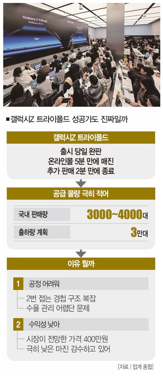 삼성전자가 갤럭시Z 트라이폴드의 출하량을 극도로 줄인 배경이 여기에 있다. 만들기는 힘들고 수익성은 좋지 않을 공산이 커서다. 트라이폴드의 인기가 '적은 출하량이 낳은 착시 효과일 수 있다'는 분석이 나오는 이유다. 익명을 원한 업계 관계자는 "갤럭시Z 트라이폴드의 흥행엔 수많은 변수가 깔려 있다"면서 "트라이폴드가 삼성의 효자 제품으로 등극할 수 있을지는 더 지켜봐야 한다"고 말했다.