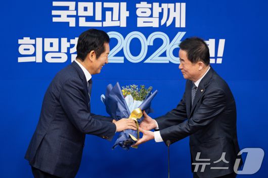 (서울=뉴스1) 유승관 기자 = 정청래 더불어민주당 대표가 12일 서울 여의도 국회에서 열린 최고위원회의에 앞서 강득구 신임 최고위원에게 꽃다발을 건네고 있다. 2026.1.12/뉴스1fotogyoo@news1.krCopyright ⓒ 뉴스1. All rights reserved. 무단 전재 및 재배포, AI학습 이용 금지.