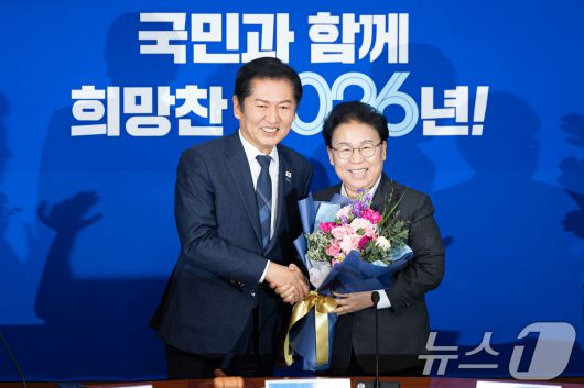 (서울=뉴스1) 유승관 기자 = 정청래 더불어민주당 대표와 문정복 신임 최고위원이 12일 서울 여의도 국회에서 열린 최고위원회의에 앞서 꽃다발을 들고 기념 촬영을 하고 있다. 2026.1.12/뉴스1fotogyoo@news1.krCopyright ⓒ 뉴스1. All rights reserved. 무단 전재 및 재배포, AI학습 이용 금지.