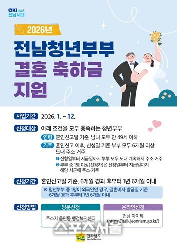 [스포츠서울┃조광태기자] 전라남도는 청년부부의 결혼 초기 경제적 부담 완화와 전남 지역 정착 유도를 위해 ‘청년부부 결혼축하금’ 200만 원을 지원한다.