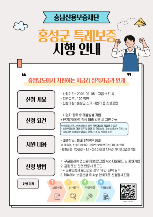 충남 홍성군이 고금리·고물가와 경기 둔화로 자금 조달에 어려움을 겪는 지역 소상공인을 지원하기 위해 ‘2026년 소상공인 특례보증 지원사업’을 본격 시행한다. 이번 사업은 담보력이 부족한 소상공인이 금융권 대출을 보다 원활하게 이용할 수 있도록 신용보증기관의 보증을 통해 자금을 지원하는 제도로, 2026년 총 120억 원 규모로 운영된다. 이는 전년도 96억 원에서 확대된 것으로, 홍성군은 지원 규모 조정을 통해 제도 접근성을 높이고 안정적인 경영 환경 조성을 도모한다는 방침이다. 지원 대상은 홍성군에 사업장을 두고 영업 중인 소상공인이며, 업체당 최대 3천만 원까지 보증 지원을 받을 수 있다. 상환 방식은 △2년 거치 일시상환 △2년 거치 3년 균등상환 △2년 거치 5년 균등상환 중 선택 가능하다. 특히 대출금리 상한제 적용, 연 1.5% 이자 지원, 연 0.9% 이내 보증료 우대를 통해 금융 이용 부담을 대폭 낮췄다. 군은 이를 통해 금융 접근성이 낮은 영세 소상공인의 자금 운용 여건이 실질적으로 개선될 것으로 기대하고 있다. 신청은 ‘보증드림’ 앱을 통한 온라인 접수 또는 충남신용보증재단 내포지점 방문을 통해 가능하며, 자금 소진 시까지 선착순으로 접수한다. 자세한 사항은 충남신용보증재단 내포지점으로 문의하면 된다. 황선돈 홍성군 경제정책과장은 “불확실한 경제 여건 속에서 소상공인의 금융 부담이 가중되고 있다”며 “이번 특례보증이 자금 운용 안정과 지역 상권 회복의 마중물이 되길 기대한다”고 밝혔다.