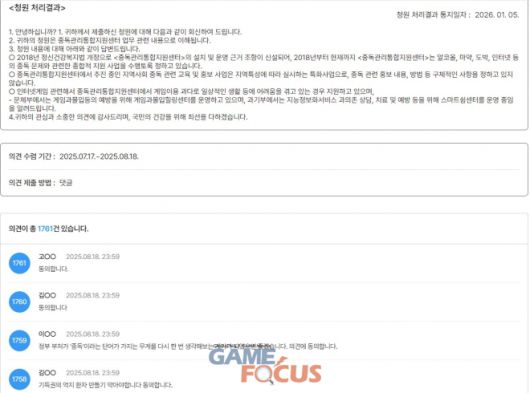 협회는 지난해 6월 「정신건강증진 및 정신질환자 복지서비스 지원에 관한 법률」 (이하 ‘정신건강복지법’)에 없는 '게임'을 복지부가 임의로 중독 관리 대상으로 지정한 것은 법률 해석의 왜곡이며, 게임 문화와 산업에 부정적 영향을 미치므로 보건복지부 홈페이지 내 정신건강복지법에 명시되지 않은 '게임'이라는 표현을 즉시 삭제할 것을 요청하는 취지의 공개 청원을 제기하였으며, 1,761명의 국민들이 함께 의견을 남겼다.