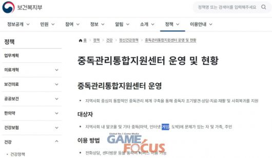 현재까지도 보건복지부 홈페이지 내 정신건강정책 안내 페이지 및 다수의 지역 중독관리통합지원센터는 ‘알코올’, ‘마약’, ‘도박’과 함께 '인터넷 게임'을 중독 관리 대상으로 표기하고 있다.