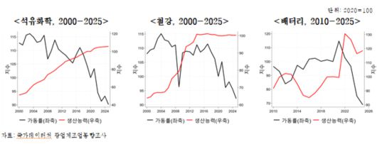 보고서는 석유화학·철강·배터리 산업이 생산능력은 지속 확대된 반면 가동률은 급락하는 '구조적 과잉공급' 상태에 장기간 머물러 있다고 분석했다. 중국의 대규모 증설 등 외부 환경 변화는 이미 예견됐지만, 기업들은 "경기 회복 시 수요가 늘 것"이라는 낙관론에 기대 설비 감축 대신 버티기 전략을 선택했고, 그 결과 선제 대응의 골든타임을 놓쳤다는 평가다.