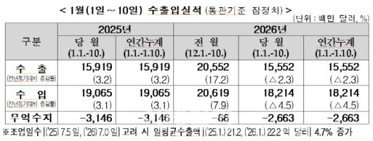 다만 실제 조업 일과 휴일 등을 고려한 하루 평균 수출액은 22억 2000만달러로 1년 전보다 4.7% 늘었다. 이달 1∼10일 조업일수는 7일로 작년보다 0.5일 적었다.