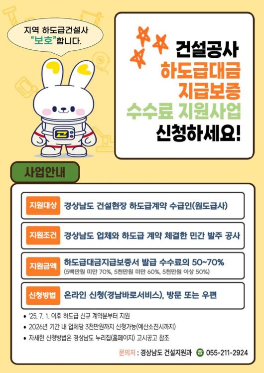 이 사업은 도내 민간 건설 현장에서 지역업체와 하도급 계약을 맺은 원도급사에 보증서 발급 수수료의 일부를 지원하는 것으로, 2023년 7월 경남도가 전국 처음 도입했다.