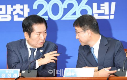 [이데일리 노진환 기자] 정청래 더불어민주당 대표와 한병도 신임 원내대표가 12일 오전 서울 여의도 국회에서 열린 최고위원회의에서 대화하고 있다.