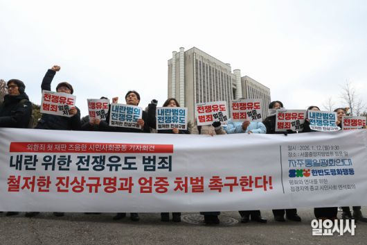 자주평일평화연대 등 시민단체가 12일 오전 서울 서초구 서울중앙지방법원 앞에서 열린 ‘내란 위한 전쟁유도 범죄 철저한 진상규명 및 처벌 촉구 기자회견’에서 구호를 외치고 있다.