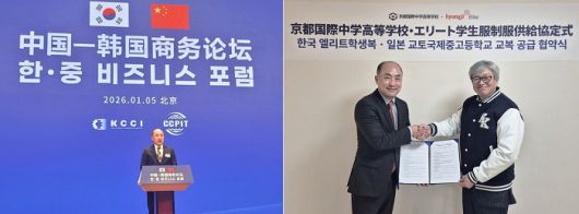 (왼쪽)방중 경제사절단 한중 비즈니스 포럼에서 김남용 형지엘리트 상무가 ‘AI 웨어러블로봇’ 주제 발표를 하는 모습, (오른쪽)교토국제중고등학교에서 진행된 협약식에서 (좌)김남용 형지엘리트 상무와 (우)김정홍 교토국제중고등학교 이사장이 협약서를 교환하며 악수를 하는 모습 |