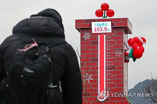 (서울=연합뉴스) 서대연 기자 = 12일 서울 종로구 광화문 광장에 설치된 사랑의 온도탑에 나눔온도가 103.9도를 나타내고 있다.