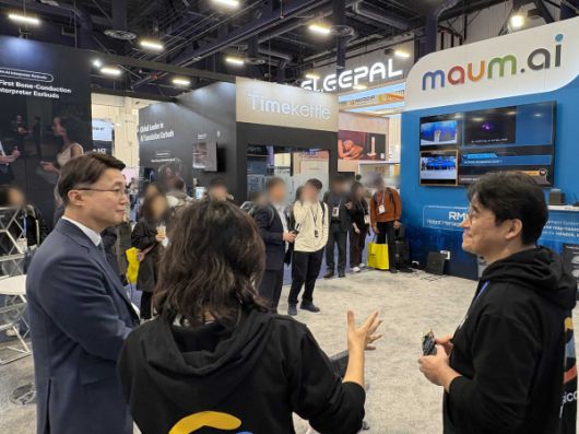 CES2026에서 과학기술정보통신부 류제명 제2차관(오른쪽)이 방문하여 마음AI의 로봇시연을 보고 관심을 보이고 있다. [사진=마음AI]마음AI는 세계 최대 IT 전시회 CES 2026 참가를 성공적으로 마무리했다고 12일 밝혔다. MAIED(Maum AI Edge Device)를 기반으로 Vision–Language–Action(VLA) 구조의 Physical AI, 즉 AI가 보고(Vision)·판단하고(Language)·행동하는(Action) 실행형 AI 구조를 글로벌 현장에서 입증했다는 설명이다.