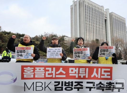 (서울=뉴스1) 김진환 기자 = 민주노총 마트산업 노동조합 홈플러스지부 조합원들이 12일 오전 서울 서초구 서울중앙지법 앞에서 기자회견을 열고 김병주 MBK파트너스 회장을 비롯한 경영진의 구속을 촉구하고 있다. 2026.1.12/뉴스1