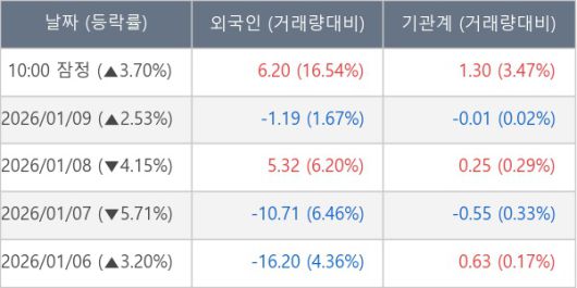 [서울=뉴스핌] 로보뉴스 = 12일 10시 15분 현재 이구산업(025820)은 외국인과 기관이 각각 6.20 만 주, 1.30 만 주 순매수(잠정) 하면서 전일 대비 3.70% (현재가 5,890원) 상승하고 있다.