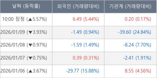 [서울=뉴스핌] 로보뉴스 = 12일 10시 15분 현재 에코프로(086520)는 외국인과 기관이 각각 6.49 만 주, 0.20 만 주 순매수(잠정) 하면서 전일 대비 5.57% (현재가 92,900원) 상승하고 있다.