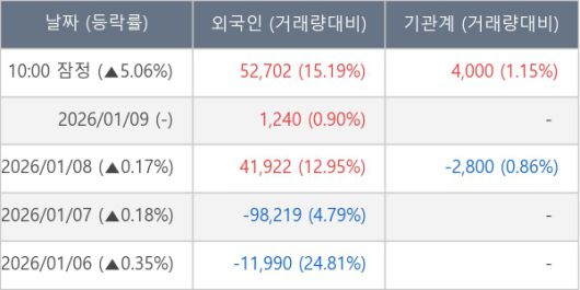 [서울=뉴스핌] 로보뉴스 = 12일 10시 15분 현재 티플랙스(081150)는 외국인과 기관이 각각 5.27 만 주, 0.40 만 주 순매수(잠정) 하면서 전일 대비 5.06% (현재가 3,010원) 상승하고 있다.