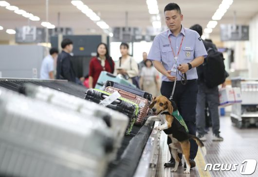 농림축산검역본부 영남지역본부 검역탐지견과 탐지요원이 대구공항에 도착한 수하물을 검색하고 있다. ⓒ News1 DB |