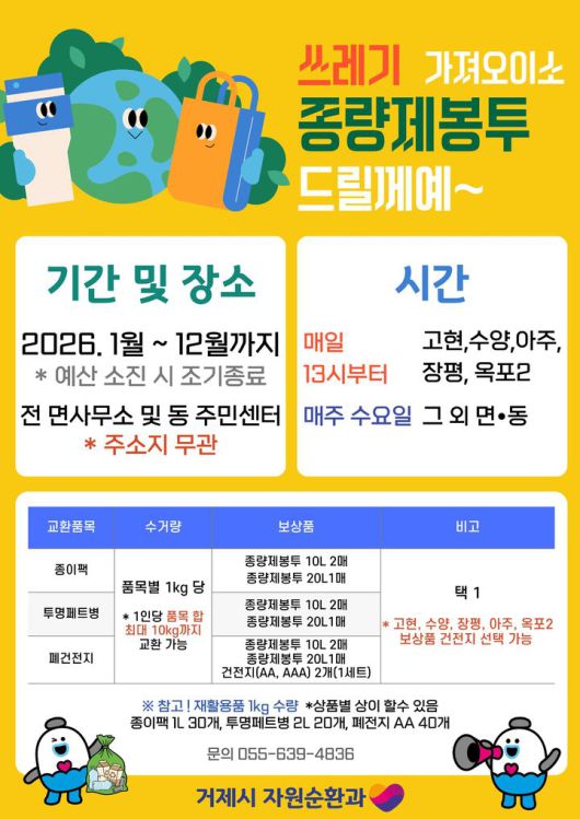 [거제=뉴시스] 신정철 기자 = 경남 거제시는 지난해에 이어 2026년에도 종이팩, 폐전지, 투명페트병을 모아오면 종량제봉투로 교환해 주는 ‘재활용품 교환사업’을 지속 추진한다고 12일 밝혔다.